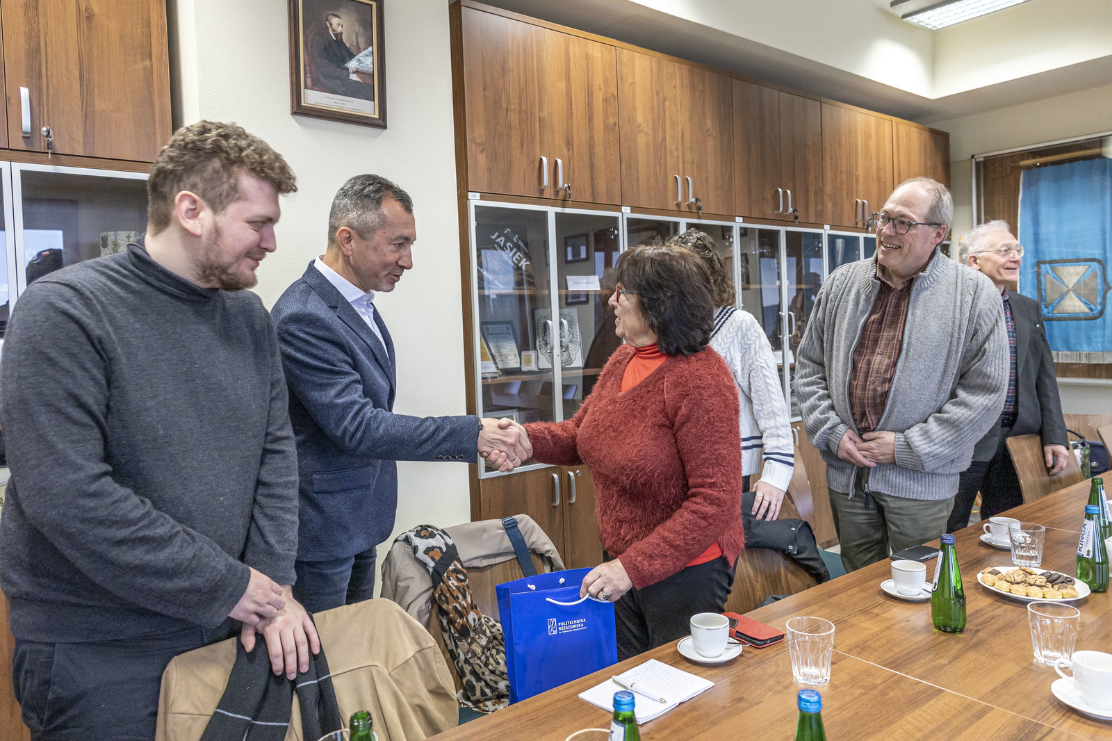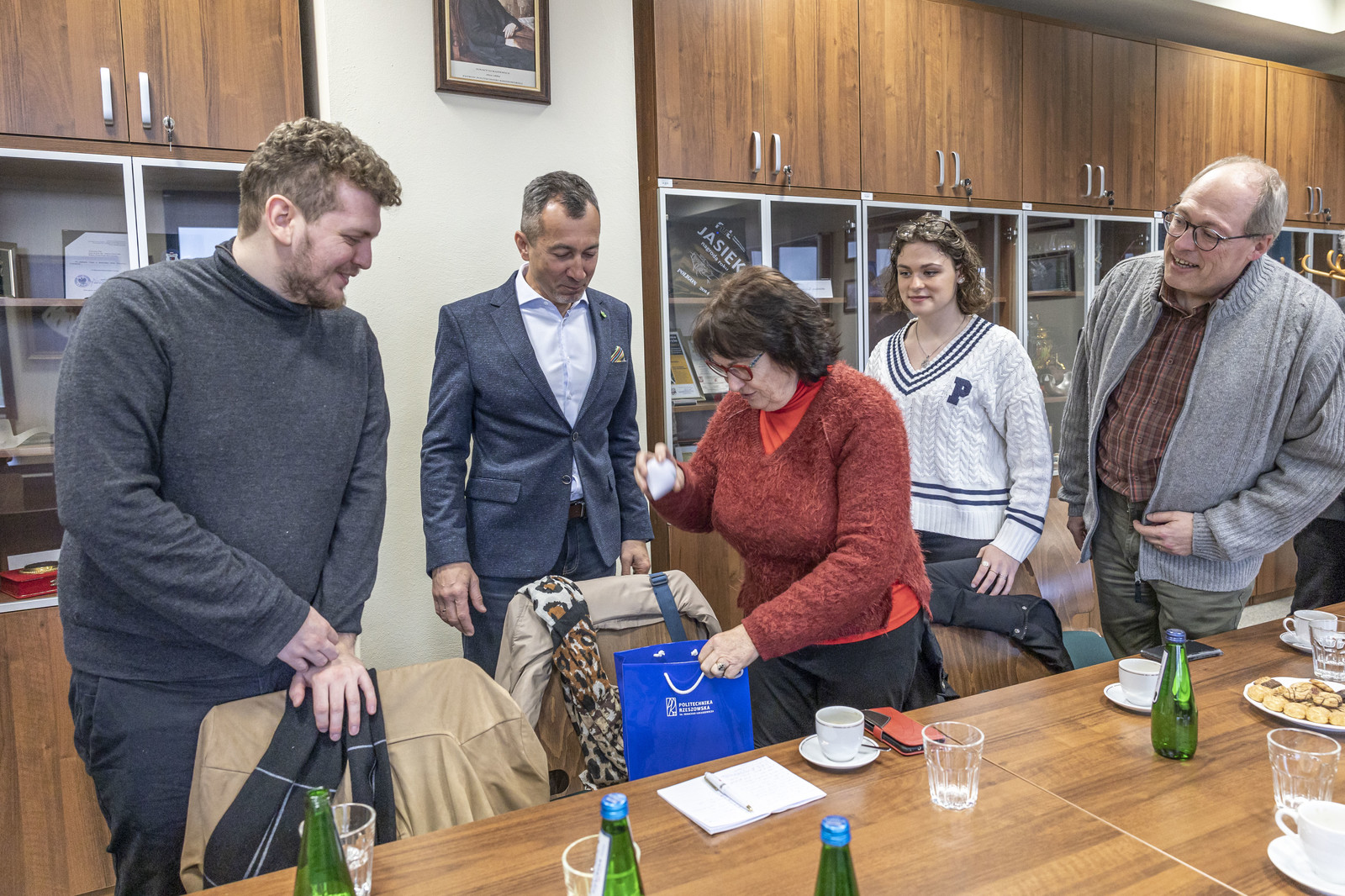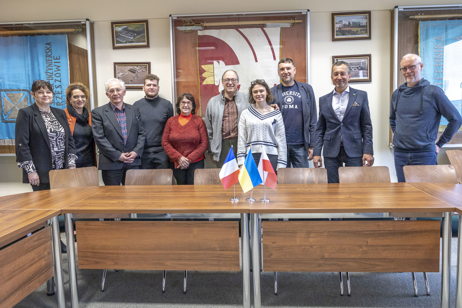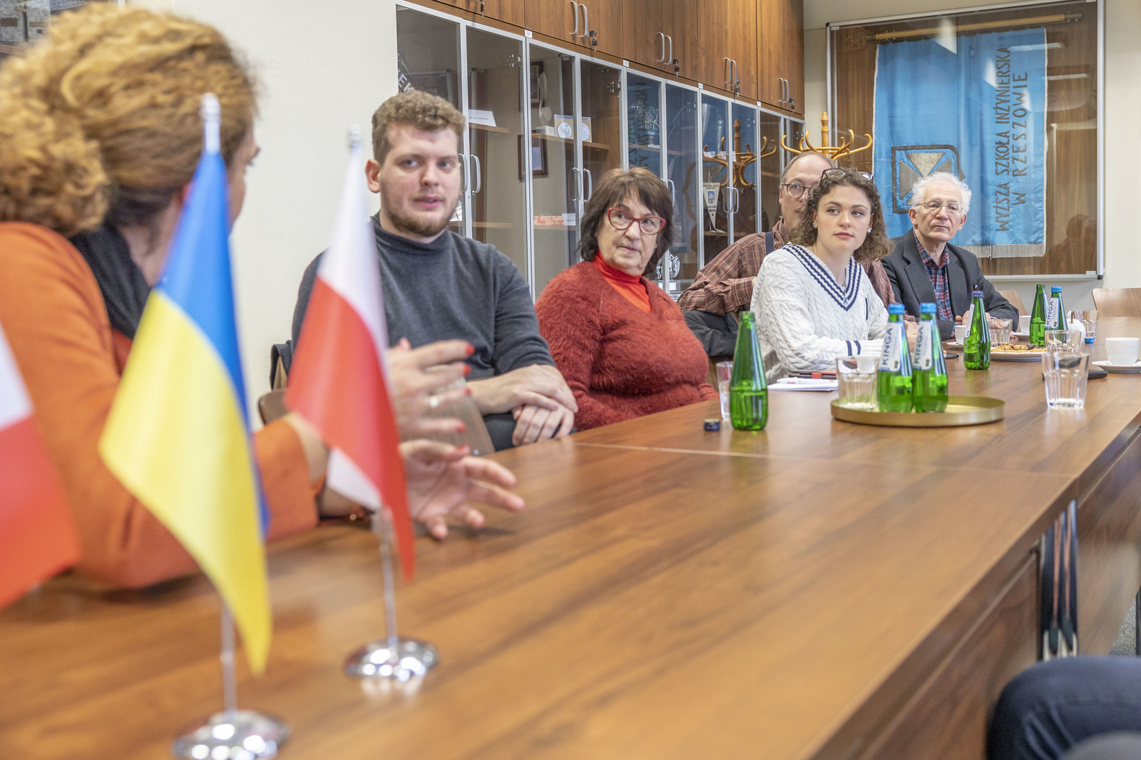 Delegacja wolontariuszy odwiedziła również Politechnikę Rzeszowską, gdzie spotkała się z Prorektorem ds. studenckich, prof. dr hab. Grzegorzem Ostaszem. W spotkaniu uczestniczył dr hab. Yuriy Bilan, prof. PRz koordynator akcji w Rzeszowie, Kierownik Działu Współpracy Międzynarodowej mgr Edyta Ptaszek, Z-ca dyrektora Centrum Języków Obcych mgr Aneta Sondej. Rozmowy dotyczyły obecnej sytuacji na Ukrainie, działań edukacyjnych wspierających podejmowanie studiów przez uchodźców oraz prezentację uczelni.