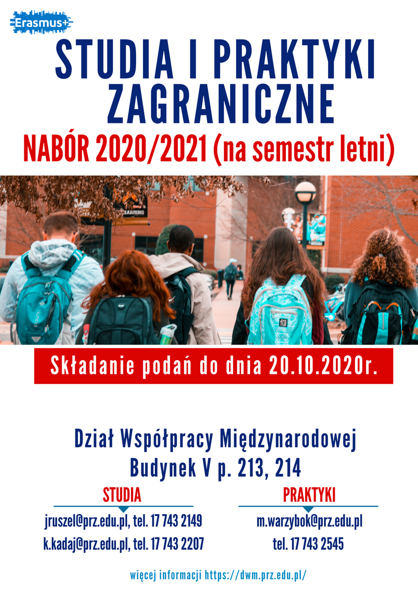 Serdecznie zapraszamy na studia i praktyki w ramach Programu Erasmus+ na semestr letni 2020/2021.
