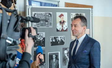 Prorektor ds. współpracy międzynarodowej prof. dr hab. Grzegorz Ostasz wygłosił referat okolicznościowy z okazji odsłonięcia muralu upamiętniającego doc. Romana Niedzielskiego