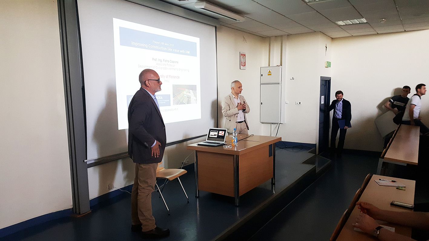 W dniach 21-25 maja na Wydziale Budownictwa, Inżynierii Środowiska i Architektury gościli profesorowie Carlo Biagini z Wydziału Architektury Uniwersytetu we Florencji oraz Pietro Capone z Wydziału Budownictwa i Inżynierii Środowiska tego uniwersytetu. Wizyta, która miała charakter dydaktyczny, odbyła się w ramach programu Erasmus+. Najważniejszymi punktami pobytu gości z Florencji były przeprowadzone przez nich wykłady, które dotyczyły nowatorskich zastosowań technologii BIM (Building Information Modeling) w inwentaryzacji obiektów zabytkowych oraz organizacji placu budowy. Wykładu prof. Biagini nt. BIM in documentation, refurbishment and management of historical building heritage wysłuchali przede wszystkim studenci III roku studiów I stopnia na kierunku architektura oraz grupa nauczycieli akademickich Wydziału, natomiast słuchaczami wykładu prof. Capone nt. BIM and construction and safety management byli studenci III roku studiów I stopnia oraz I roku studiów II stopnia na kierunku budownictwo, wraz ze swoimi nauczycielami akademickimi.