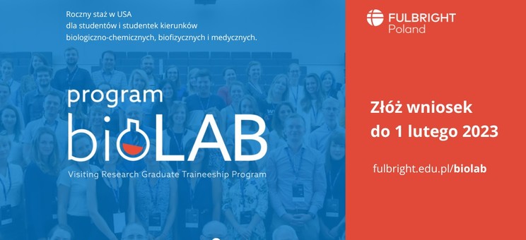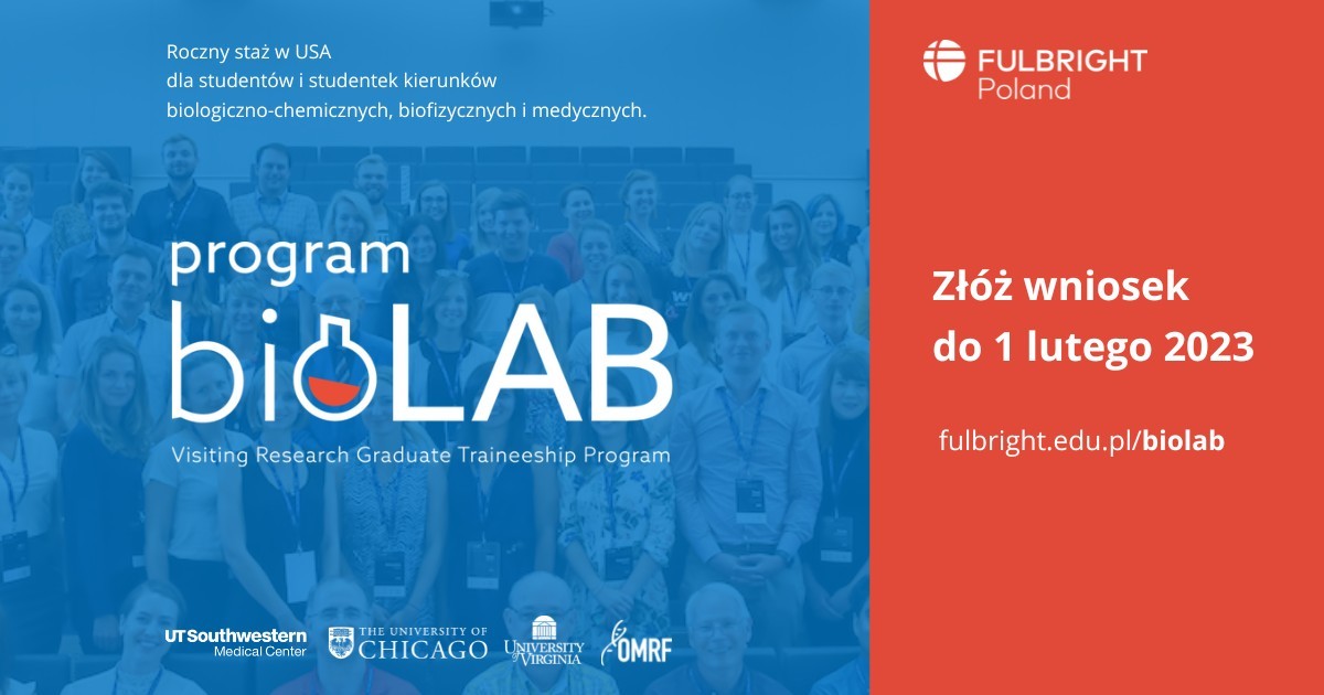 Polsko-Amerykańska Komisja Fulbrighta zaprasza studentów i studentki, również studiów doktoranckich, nauk biologiczno-chemicznych, biofizycznych i medycznych do składania wniosków do Programu BioLAB 2023-24. Nabór wniosków trwa do 1 lutego 2023 r.