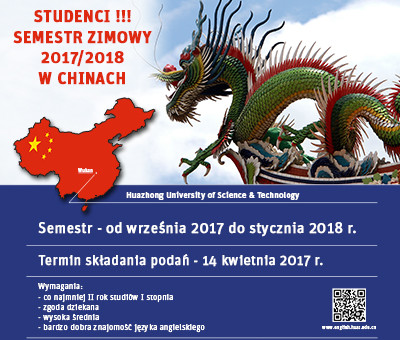 Do 14 kwietnia 2017 r. trwa rekrutacja na studia w Chinach. Studenci PRz mają możliwość odbycia jednego semestru studiów w Chinach na Huazhong University of Science and Technology, Wuhan http://english.hust.edu.cn.