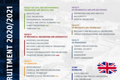 Od 1 lipca 2020 r. kandydaci na studia będą mogą wybierać spośród 30 kierunków studiów. Nabór prowadzony będzie również na siedem kierunków studiów I stopnia w języku angielskim. Są to kierunki: biotechnology, civil engineering, electrical engineering, chemical and proces engineering, mathematics, mechatronics, management.