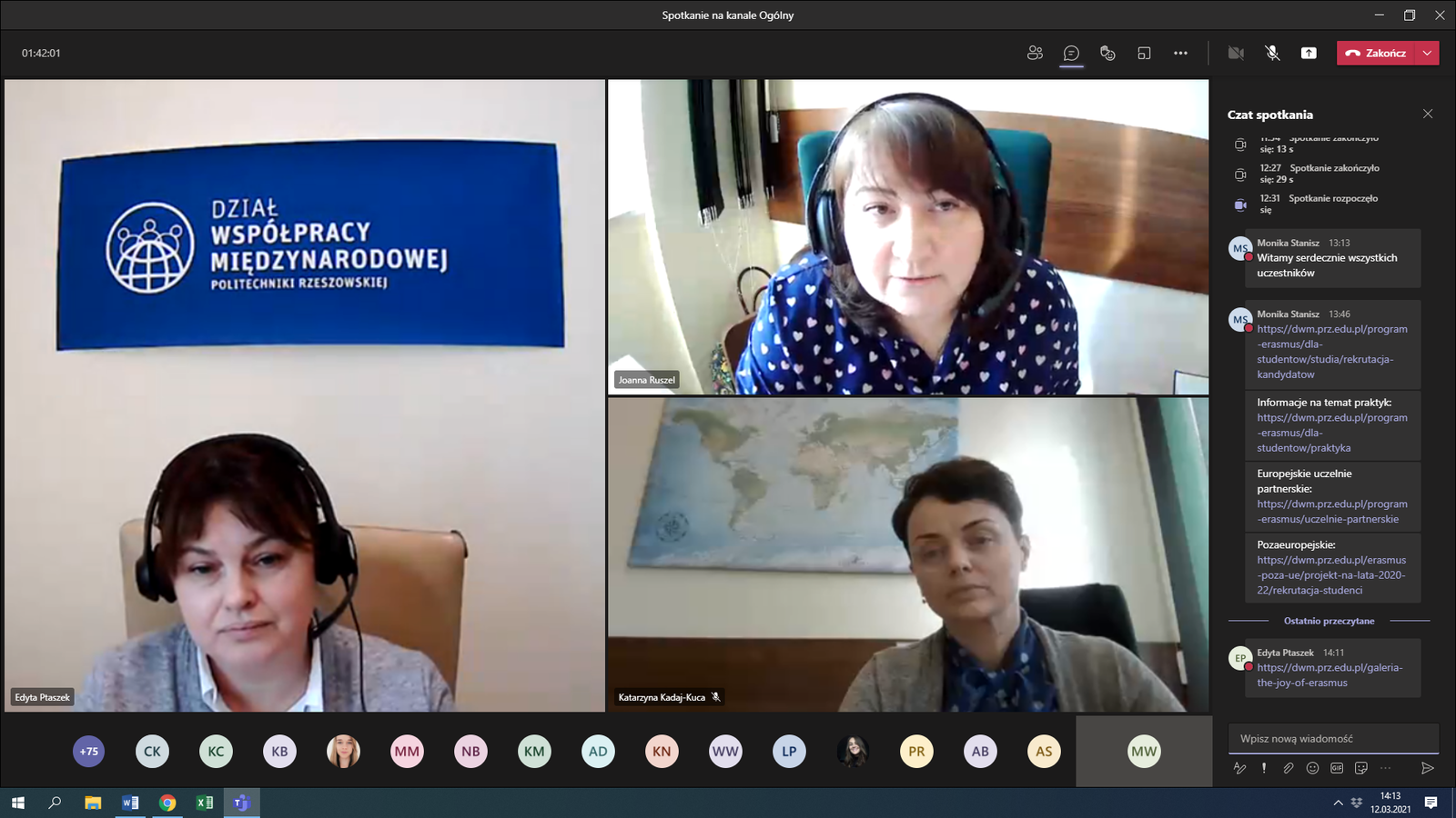 12 marca 2021r. pracownicy Działu Współpracy Międzynarodowej zorganizowali spotkanie online ze studentami Politechniki Rzeszowskiej dotyczące rekrutacji na studia oraz praktyki zagraniczne w ramach programu Erasmus+.