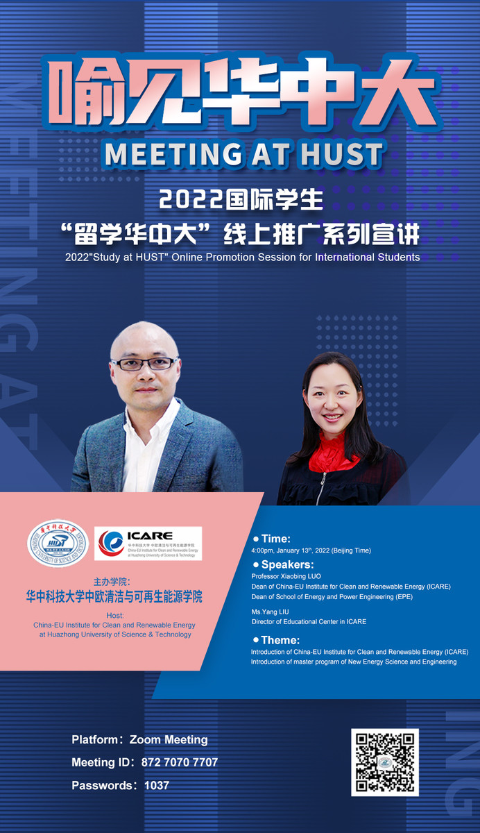 Welcome to join our 2022“Study at HUST” Online Promotional Session--Meeting China-EU Institute for Clean and Renewable Energy (ICARE) and School of Energy and Power Engineering at 15:00 pm, January 13th, 2022 (Beijing Time)!