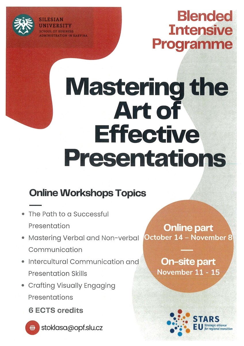 Serdecznie zapraszamy do uczestnictwa w szkoleniu odbywającym się w ramach projektu Blended Intensive Program (BIP) pt. Masteringthe Art of Effective Presentations, Silesian University, Karvina, Czechy.