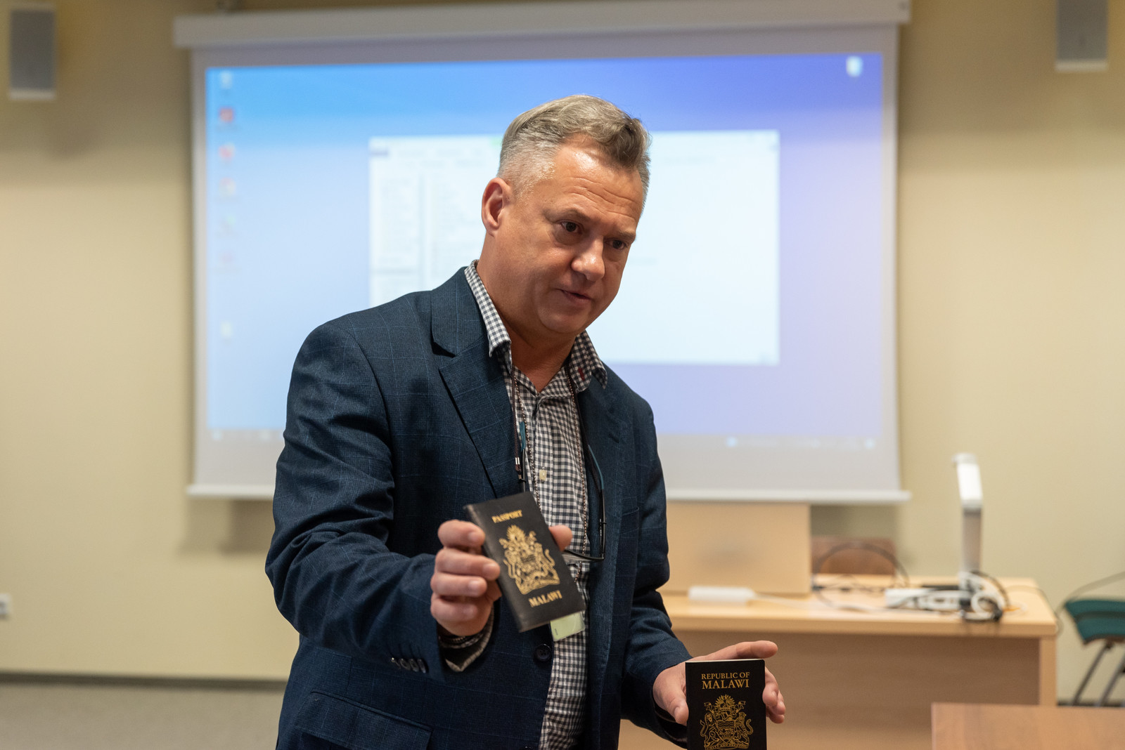 25 listopada 2022 r. odbyło się szkolenie dotyczące weryfikacji autentyczności i zabezpieczeń dokumentów wydawanych cudzoziemcom. Zajęcia poprowadził mjr Straży Granicznej mgr Dariusz Broda, ekspert z zakresu kryminalistyki oraz technicznych badań dokumentów.