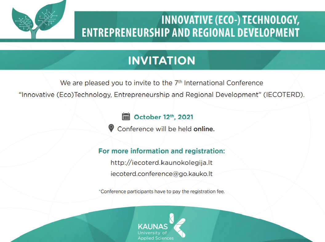 Kaunas University of Technology, Kaunas (Litwa) zaprasza na VII Międzynarodową Konferencję „Innowacyjne (eko) technologie, przedsiębiorczość i rozwój regionalny” (IECOTERD), która w formule online odbędzie się 12 października 2021 roku.