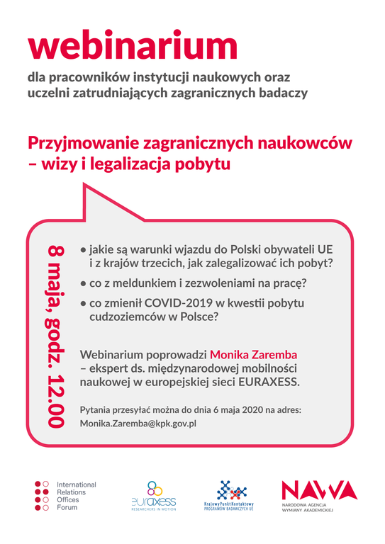 8 maja o godzinie 12:00 Narodowa Agencja Wymiany Akademickiej zaprasza instytucje naukowe oraz uczelnie zatrudniające zagranicznych badaczy na szkolenie on-line, które poprowadzi Monika Zaremba z sieci EURAXESS Polska w Krajowym Punkcie Kontaktowym Programów Badawczych UE. Podczas 1,5-godzinnego spotkania dowiedzieć się można m.in.: