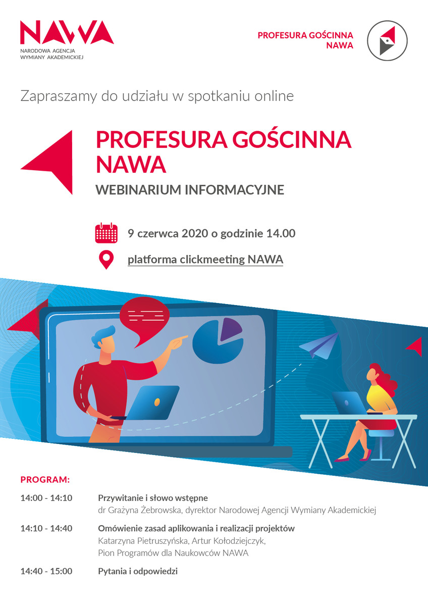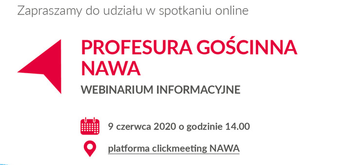 Narodowa Agencja Wymiany Akademickiej zaprasza na spotkanie online „Profesura Gościnna NAWA” – webinarium informacyjne” na temat nowego programu NAWA pt. Profesura Gościnna NAWA - wspierającego umiędzynarodowienie polskiego systemu szkolnictwa wyższego i nauki, za pomocą długookresowego atrakcyjnego pakietu finansowego.