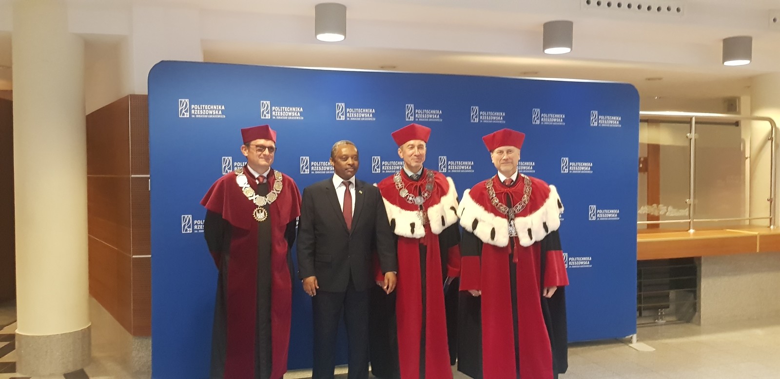 Profesor Anastase Shyaka, ambasador Rwandy w Polsce spotkał się z przedstawicielami władz uczelni, przebywał z wizytą w Ośrodku Kształcenia Lotniczego w Jasionce oraz uczestniczył w inauguracji roku akademickiego 2022/2023 na Politechnice Rzeszowskiej. W spotkaniu naszą uczelnię reprezentowali prof. dr hab. Grzegorz Ostasz oraz prof. dr hab. inż. Jarosław Sęp. Ambasadorowi towarzyszył asystent Alfred Mahirwe.
