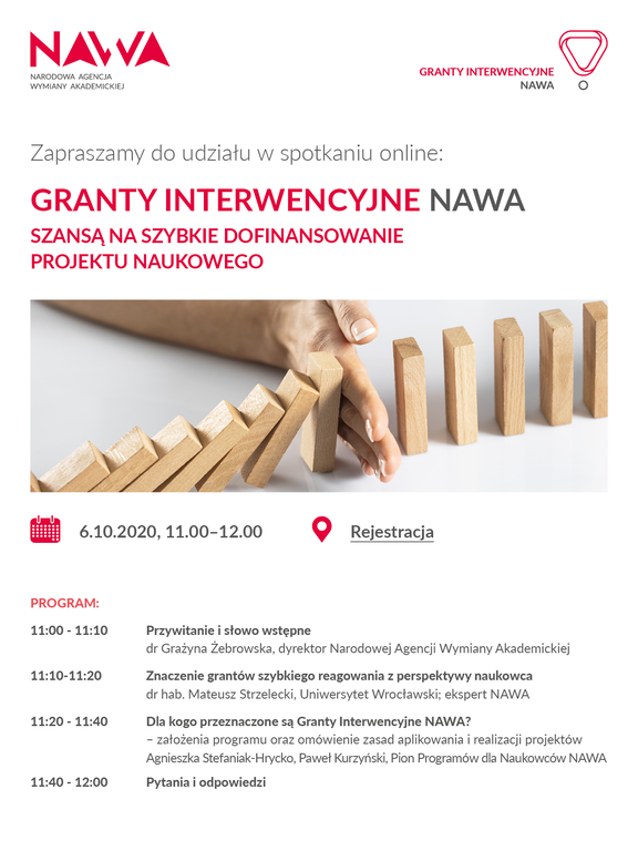 Narodowa Agencja |Wymiany Akademickiej zaprasza na spotkanie online „Granty Interwencyjne NAWA szansą na szybkie dofinansowanie projektu naukowego”.