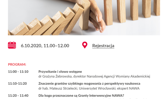 Webinarium będzie okazją do zdobycia szczegółowych informacji na temat nowego programu Narodowej Agencji Wymiany Akademickiej - Granty Interwencyjne NAWA. Odbędzie się 6 października br. w godz. 11:00-12:00.