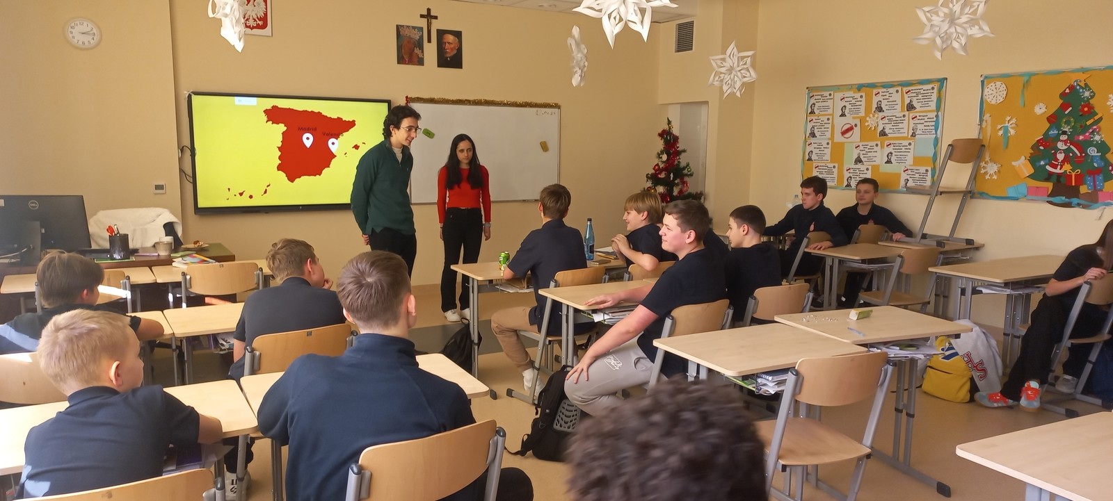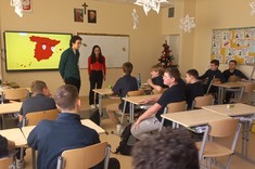 On 22nd January the Erasmus students Belén Zapatero Carretero and Gonzalo Prats Santori from Spain conducted cultural lessons for 7th and 8th grade pupils of the Public Primary School of the Piarist Order in Rzeszów. Current Erasmus students took part in 4 lessons, presenting the history, architecture and culture of Spain and organizing a quiz for the pupils. Thanks to the meeting, the students had a unique opportunity to talk in Spanish with native speakers.
