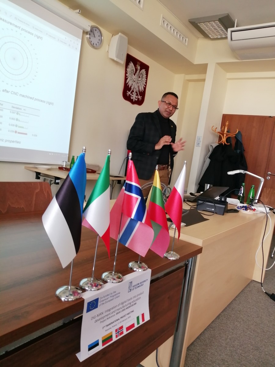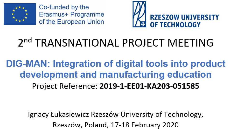 The 2nd Transnational Project Meeting of DIG-MAN project partners was held at the Rzeszów University of Technology from 17th to 18th February 2020. Project entitled DIG-MAN: Integration of digital tools into product development and manufacturing education is conducted within Erasmus+ Programme (Action 2, Strategic Partnerships). Representatives of the University of Stavanger (Norway), the Kaunas University of Technology (Lithuania), the Estonian University of Life Sciences (Estonia), the Centoform Srl (Italy) as well as the Rzeszów University of Technology staff: the coordinator on RUT’s side in the DIG-MAN project - Roman Wdowik, PhD Prof. Romana Śliwa, Marek Magdziak, PhD and Piotr Nazarko, PhD took part.