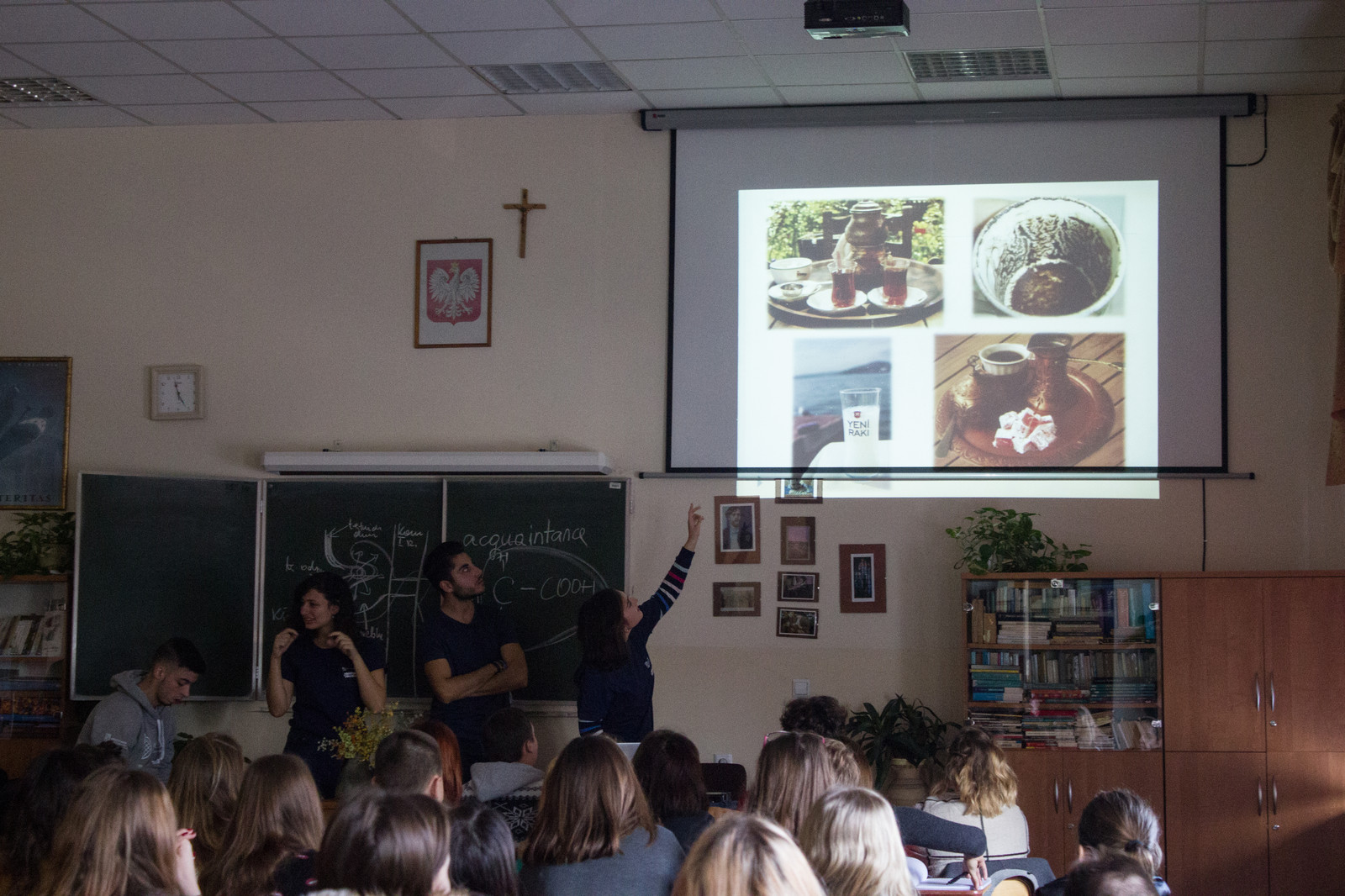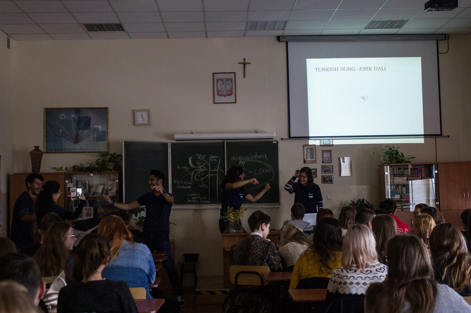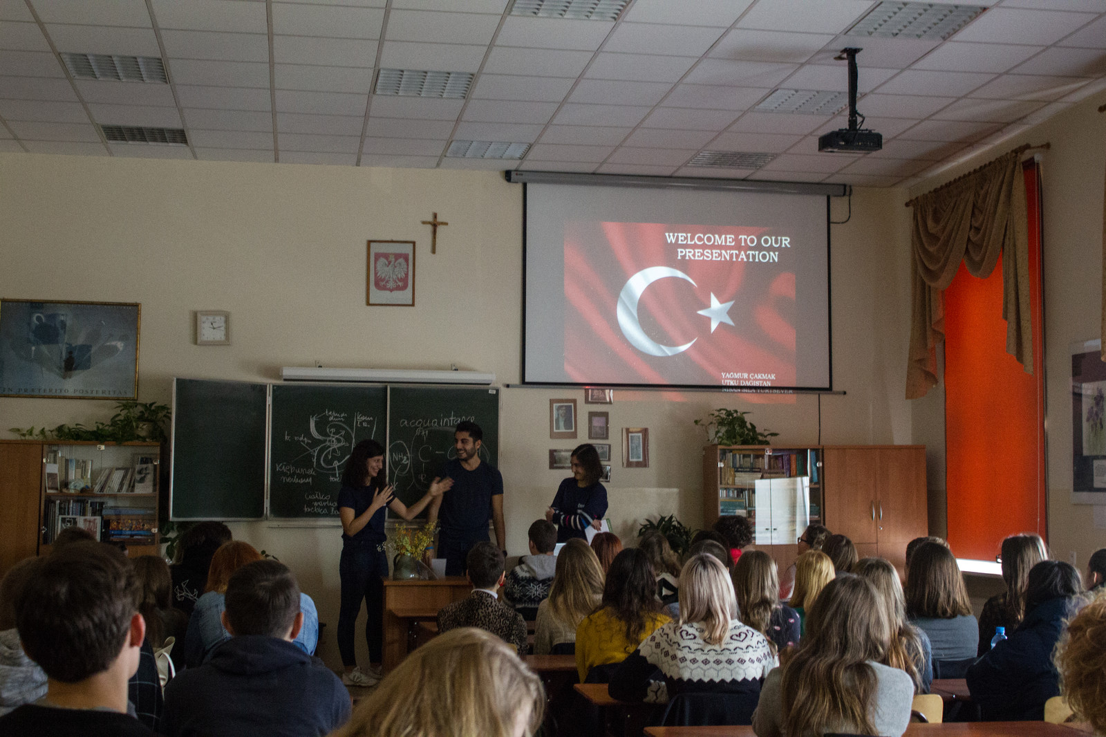 On 16th November, 2017 our foreign students from the Erasmus + programme together with the students from the Erasmus Social Club visited the Secondary School no. 1 - one of the oldest schools in Rzeszow. Students from Turkey and Georgia prepared presentations about their countries, showing their interesting history, culture and regional dishes. They broke stereotypes about life in their countries and - encouraged by the youth- they presented how they dance! Second grade students listened attentively and curiously, paying attention to what our guests were trying to convey, without hiding the surprise raised by some of the information. We hope, as the students as well, to return there again with new students from other countries! Thank you for a warm welcome and see you soon!