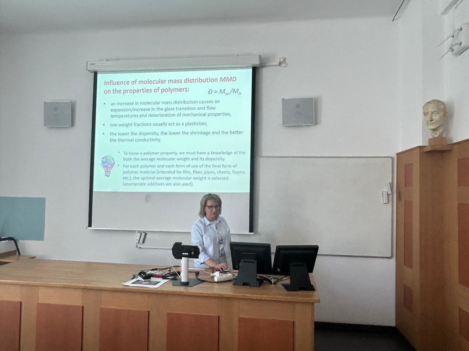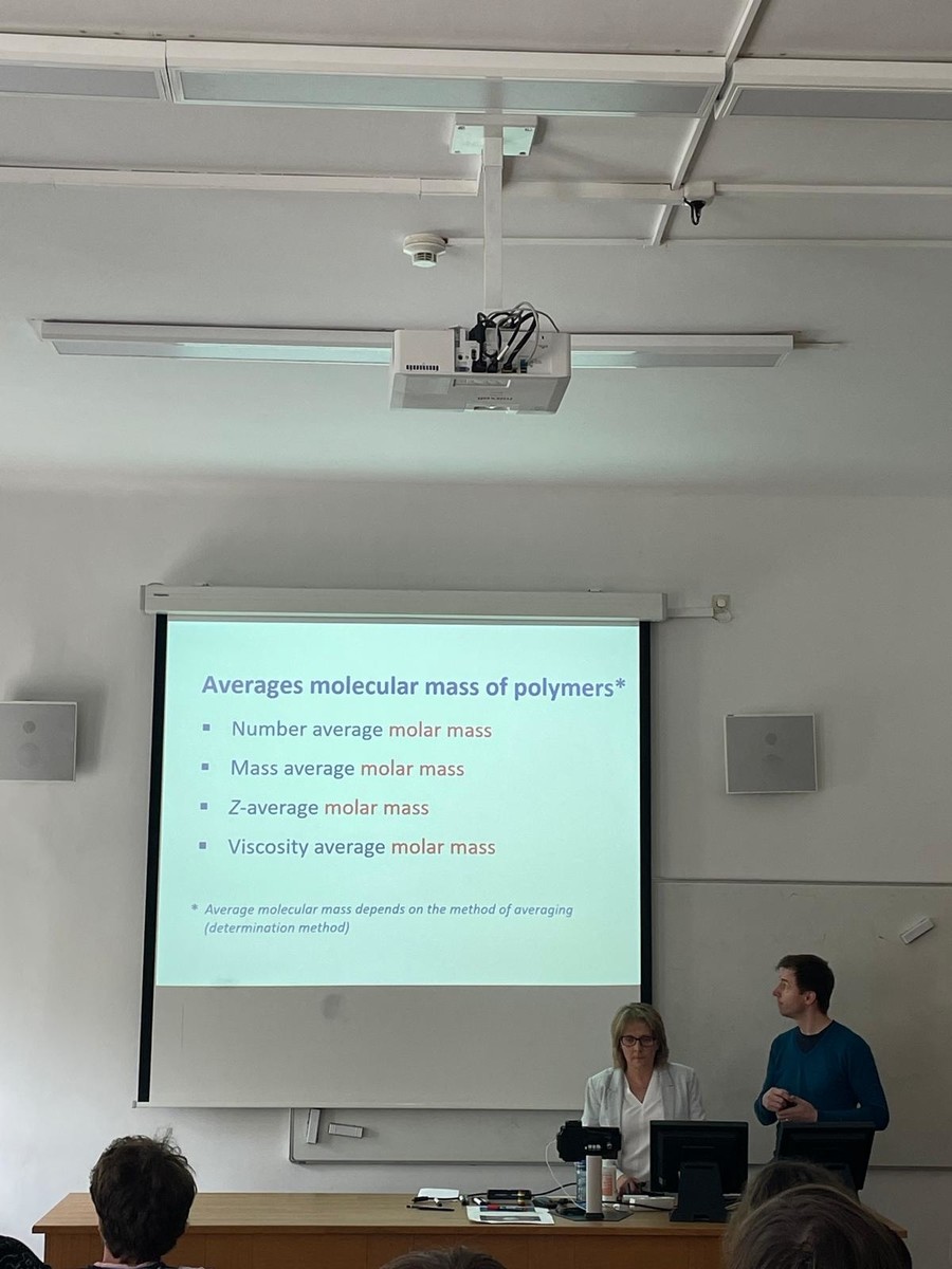 W czasie mojego tygodniowego pobytu wygłosiłam wykłady dla dwóch grup studentów. Tematyka moich wystapień dotyczyła zagadnień związanych z charakteryzowaniem morfologii i właściwości polimerów, w szczególności wyznaczania rożnymi metodami średnich mas cząsteczkowych polimerów. Pierwszy wykład, połączony z aktywną dyskusją na temat technik wykorzystujących rozpraszanie światła, zaprezentowałam dla studentów doktorantów w programie nauczania Chemia Makromolekularna (Makromolekulární chemie). Była to grupa studentów realizujących swoją pracę doktorską w Katedrze Chemii Fizycznej i Makromolekularnej. Natomiast drugą część wykładów wygłosiłam dla studentów licencjatu kierunku Chemia (Chemie), w ramach przedmiotu Chemia Makromolekularna (Makromolekulární chemie) realizowanego przez wspomnianą wcześniej Katedrę.