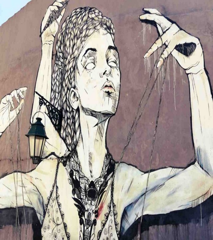 Natomiast drugi mural jest ciekawy, ponieważ spacerując wąską uliczką w jednym miejscu można zauważyć jakby lampa odzwierciedla kolczyk młodej dziewczyny. Ostatni mural w kolorach charakterystycznych dla Portugalii.