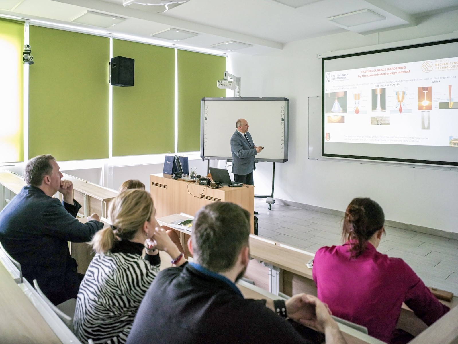 Podczas pobytu miałem przyjemność wygłosić wykład dla studentów FMMR pod tytułem „Surface hardening of cast iron”. Zarówno dla mnie jak i dla studentów było to ciekawe doświadczenie, szczególnie w części otwartej kiedy padały pytania i prowadzona była dyskusja. Studenci FMMR uzyskują doświadczenie przemysłowe podczas studiów; pracują i realizują prace dyplomowe związane z przemysłem. Wielu z nich już od pierwszego roku studiów pracuje w firmach powiązanych z ich kierunkiem studiów. Prace dyplomowe studentów każdego roku są oceniane i nagradzane podczas specjalnej konferencji, a członkami komisji oceniającej jest wielu przedstawicieli przemysłu. W kolejnej prezentacji dla studentów FMMR przedstawiłem ofertę i możliwości odbywania studiów ERASMUS na Politechnice Rzeszowskiej.